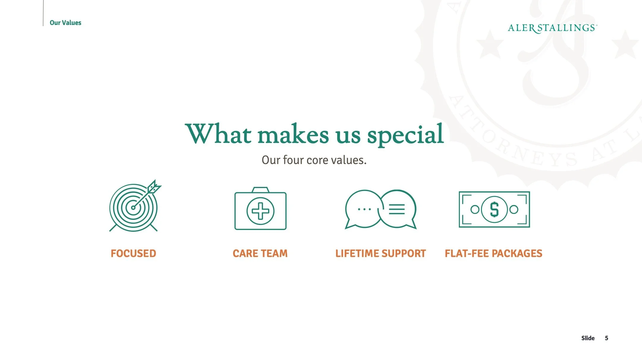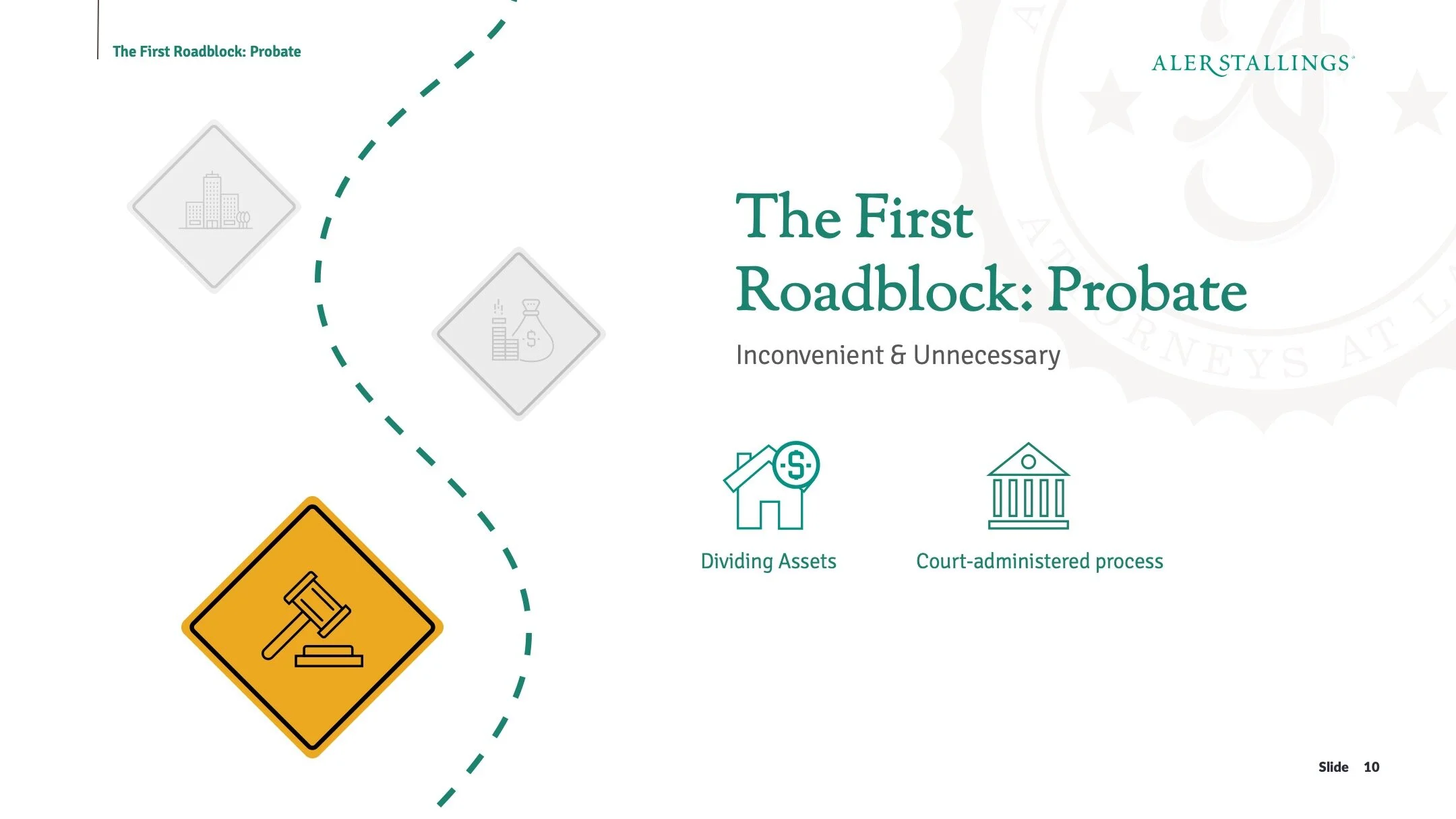 Mix of printed mailers and powerpoint presentation for AlerStallings, a law firm focusing on Estate Planning and Elder Care Law.